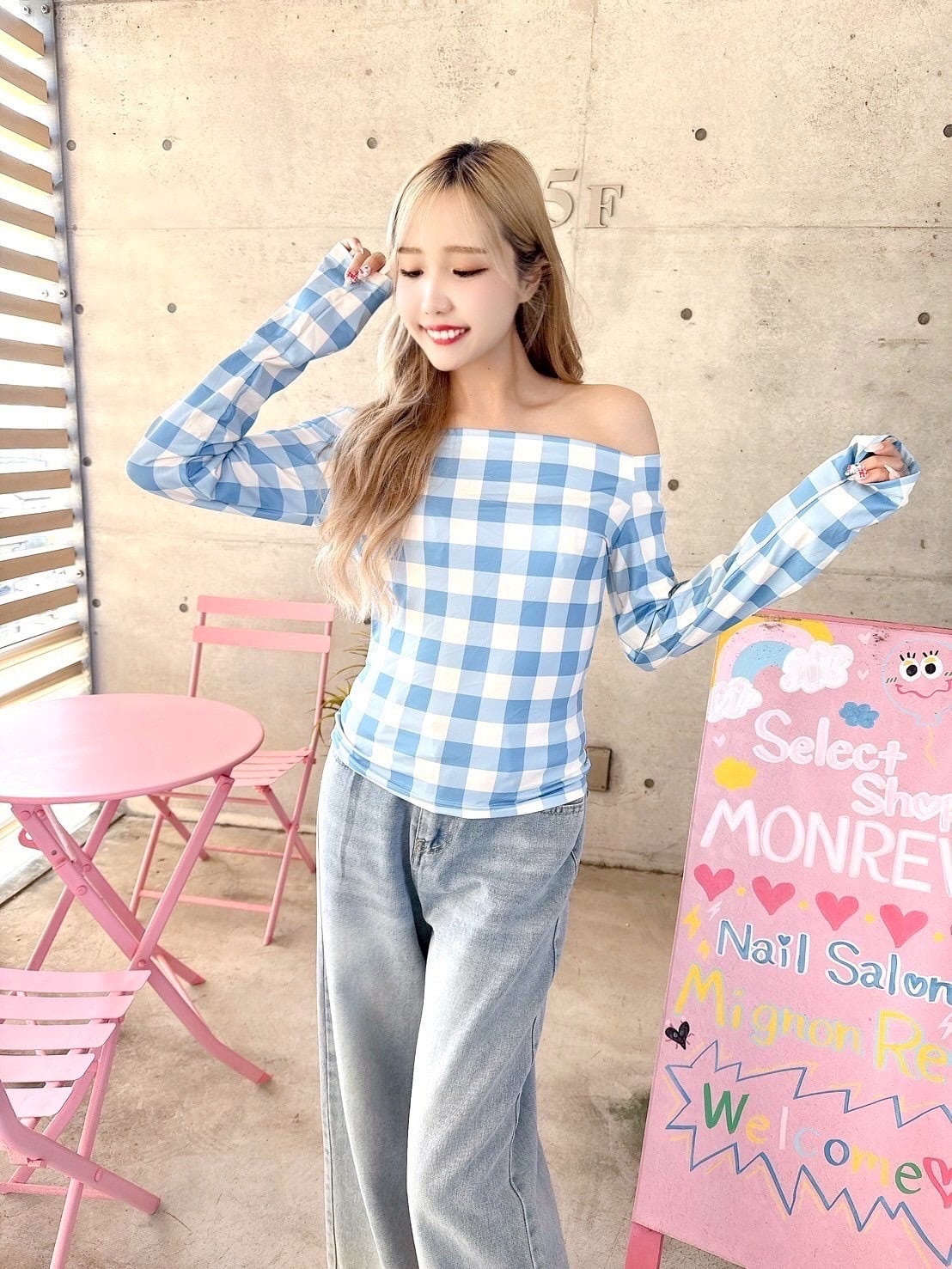Blueギンガムチェックオフショルトップス/韓国/レディースファッション/可愛い/おしゃれ/ラフ/フェミニン/大人/シンプル/秋/冬(3-382)