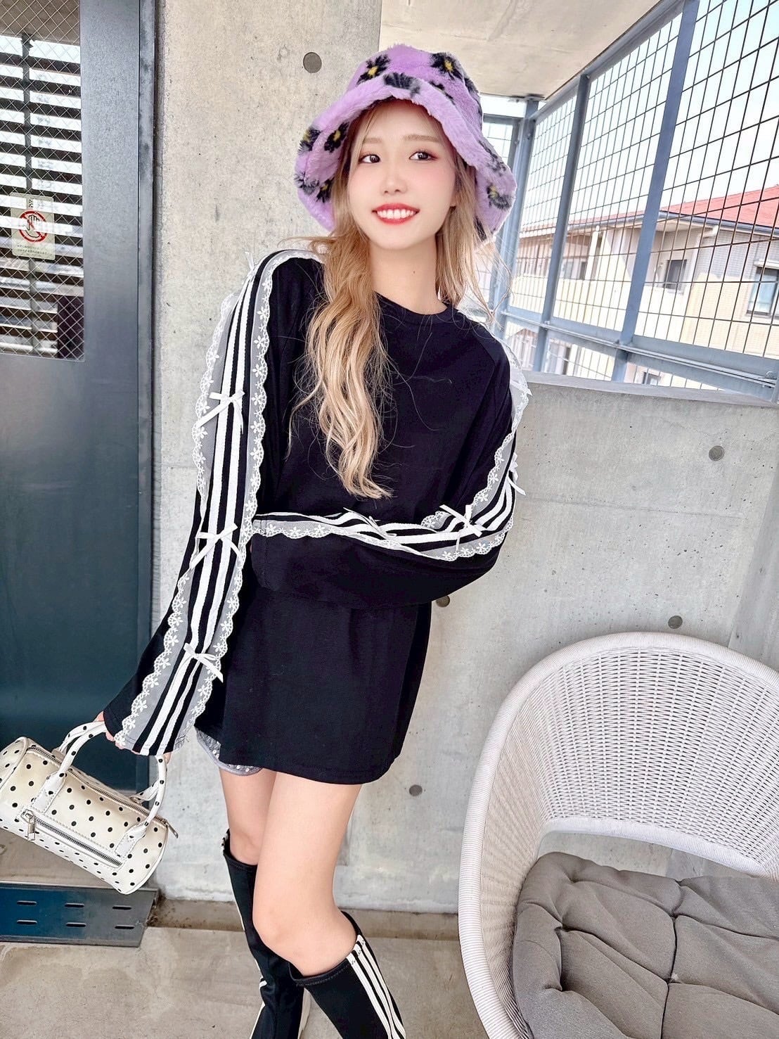 サイドラインとリボンがアクセントになった可愛いロングTシャツ♡