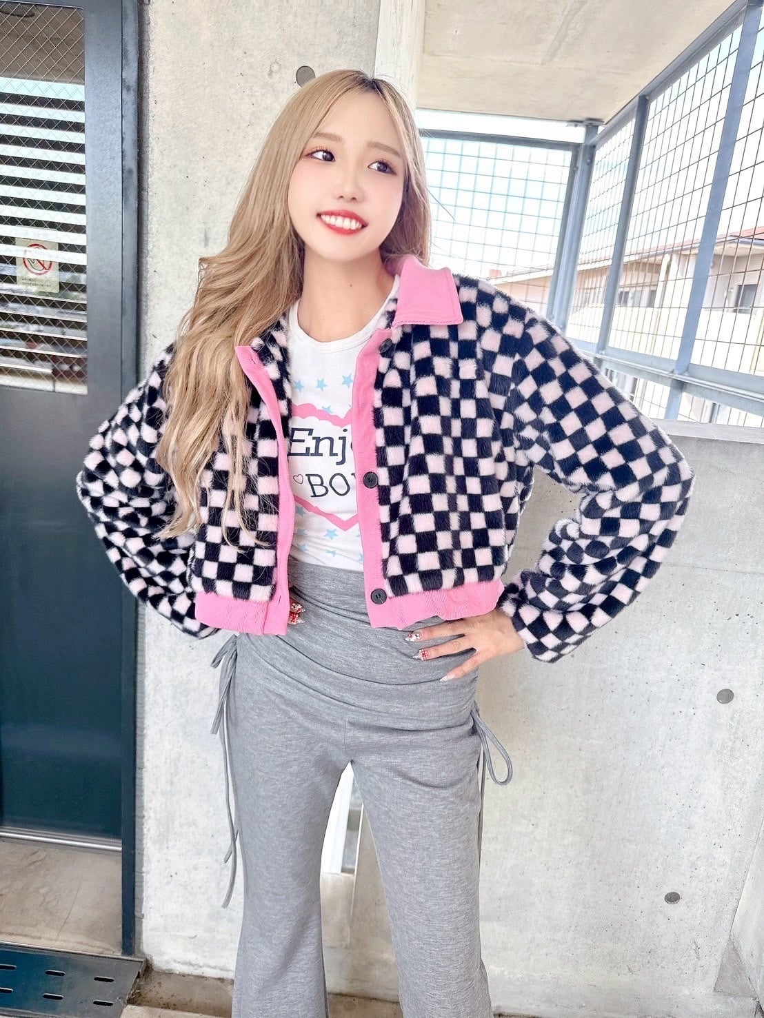 可愛いブロックチェック柄が目を引くファーブルゾン♡