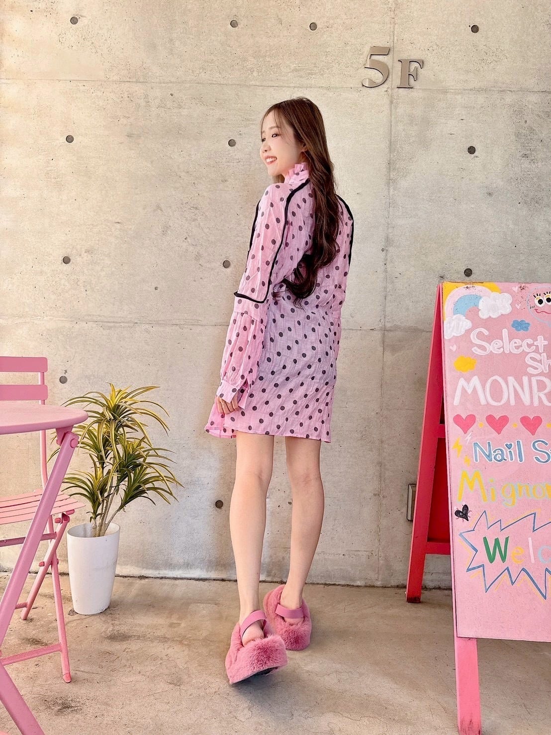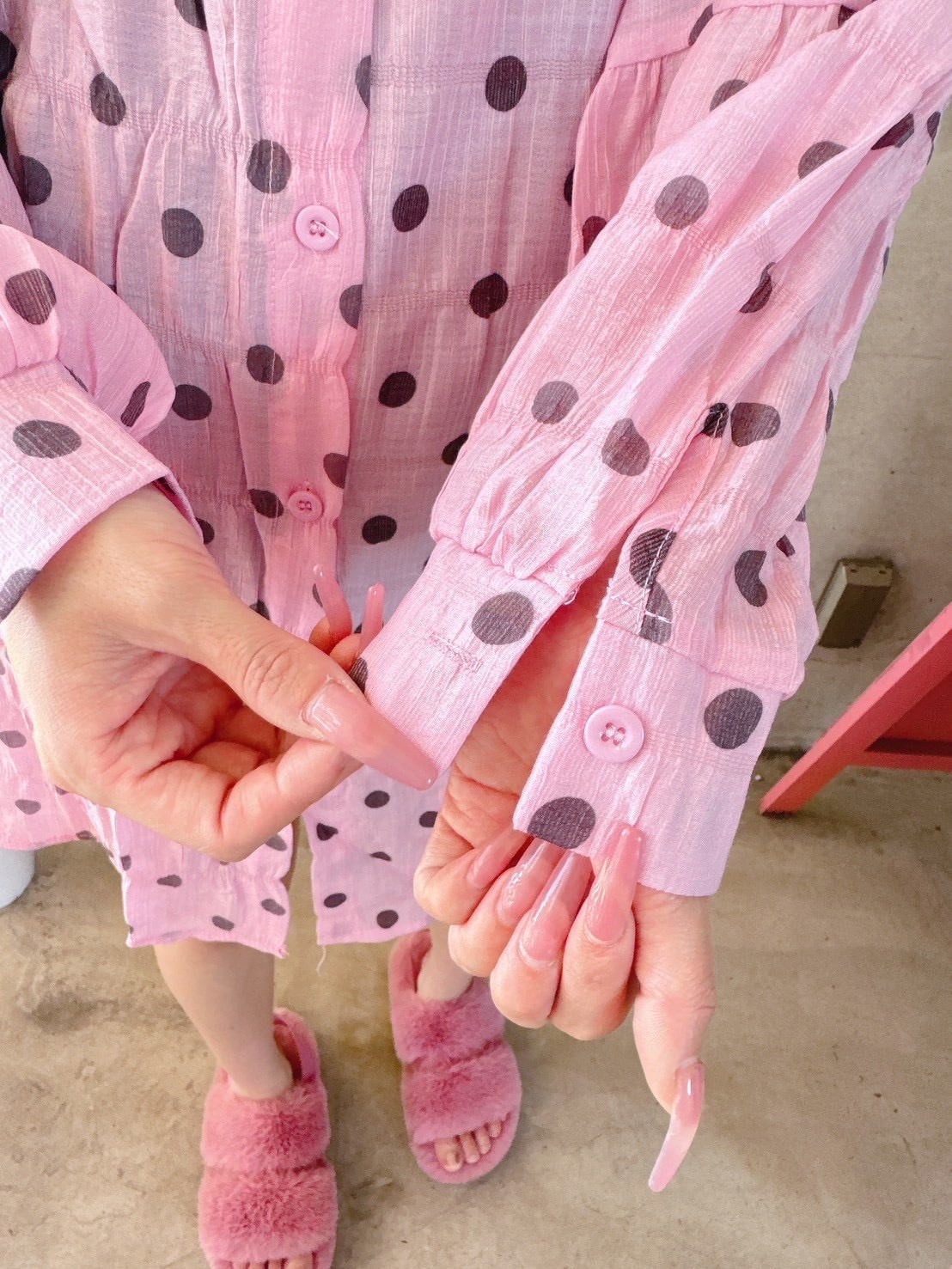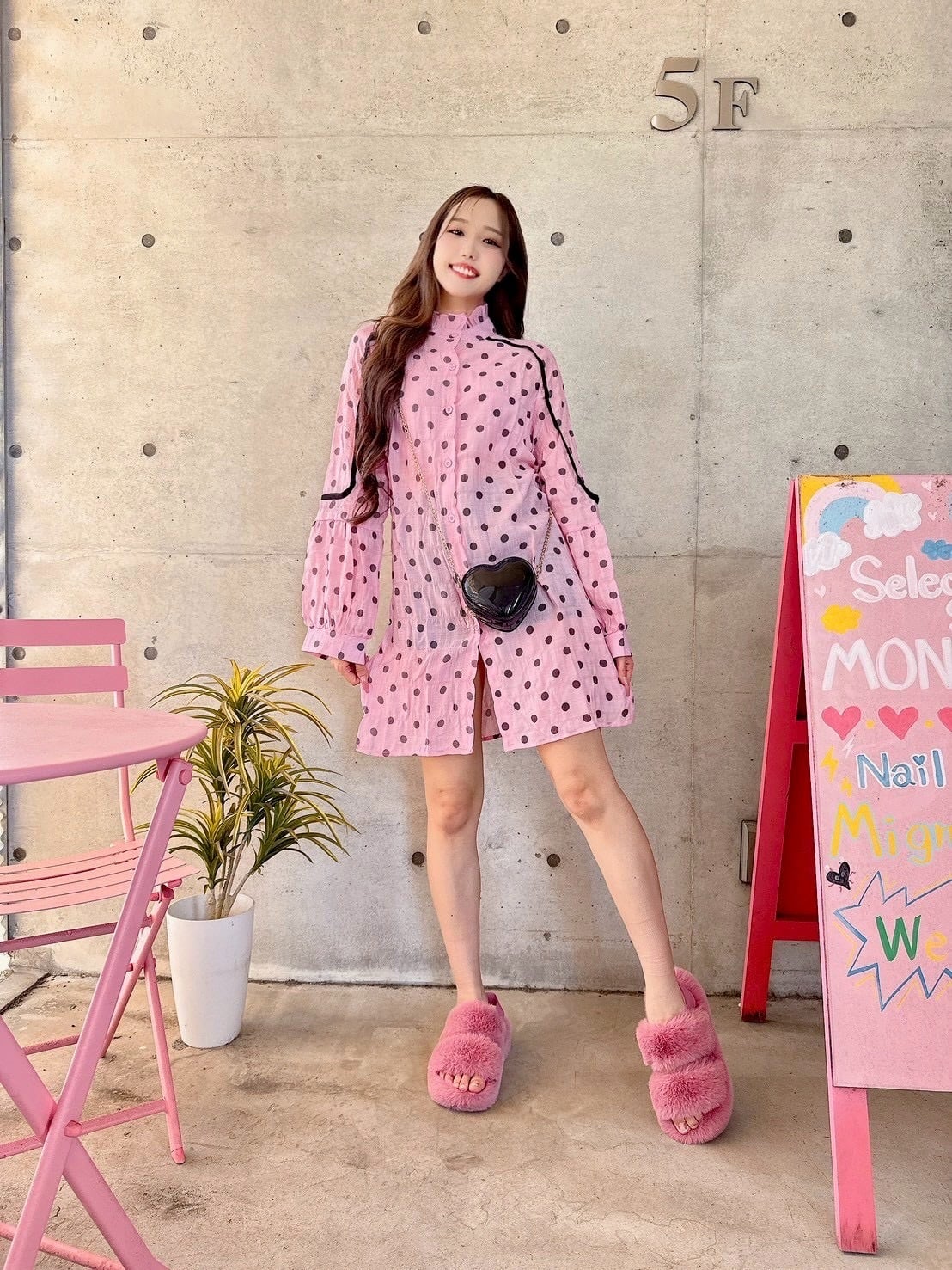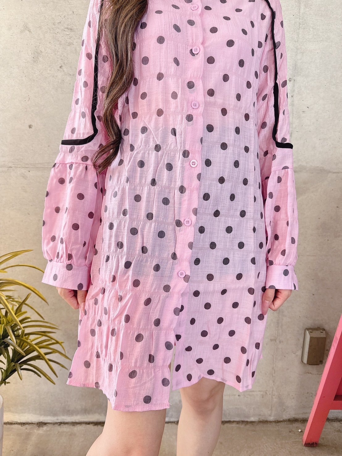 Pink♡ドットシャツワンピース/韓国/レディースファッション/可愛い/おしゃれ/ピンク/ドット/春/秋(4-190)