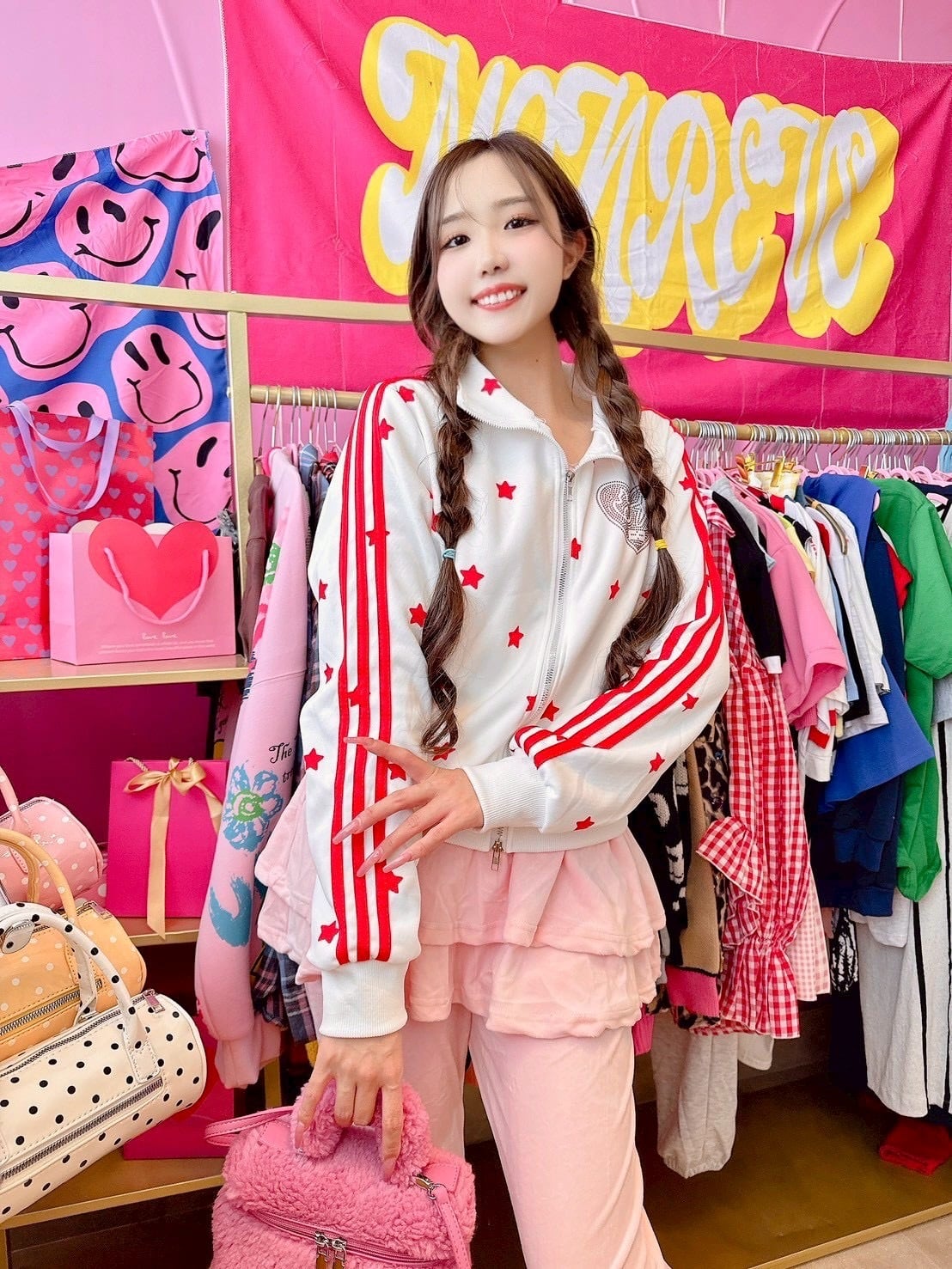 白ベースに赤色のスター柄が映えるスポーティーでキュートなパーカー☆