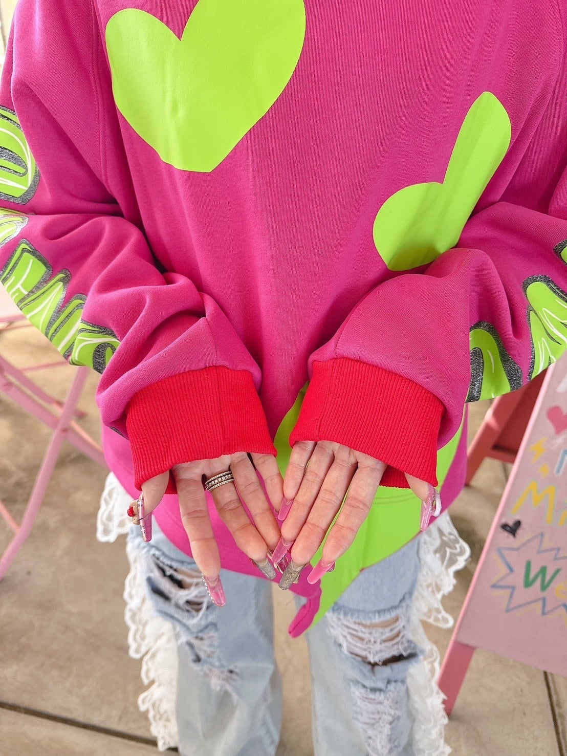 Pink♡ハートトレーナー/韓国/レディースファッション/可愛い/おしゃれ/ラフ/派手/POP/蛍光/厚手/裏起毛/秋/冬(6-228)