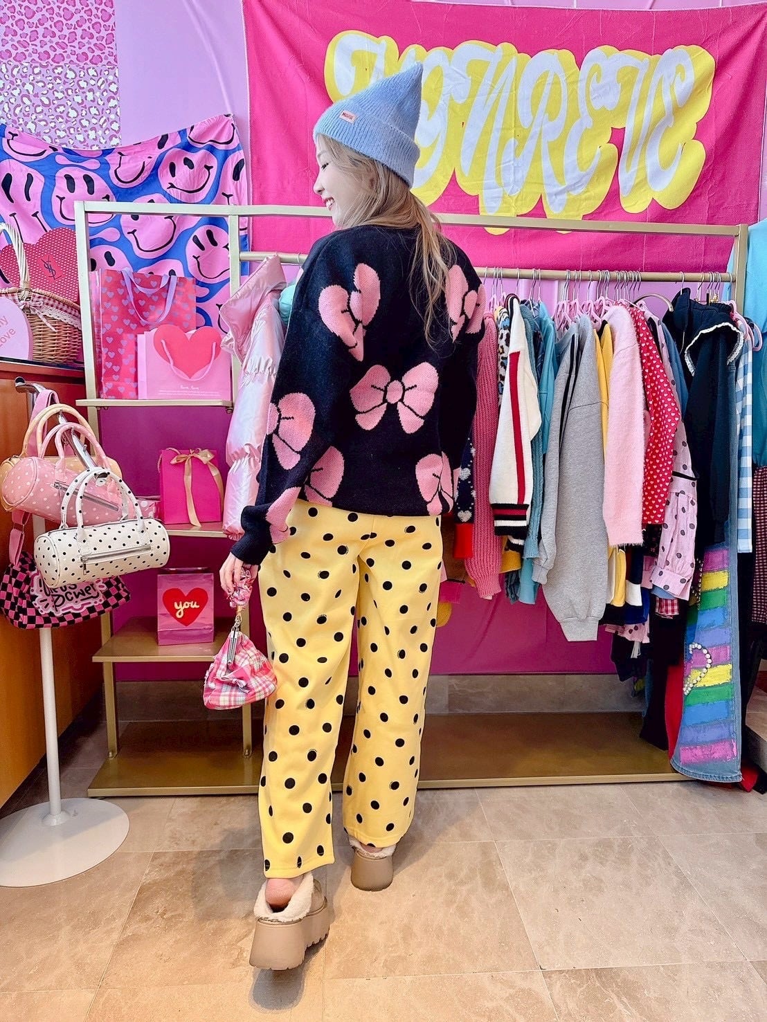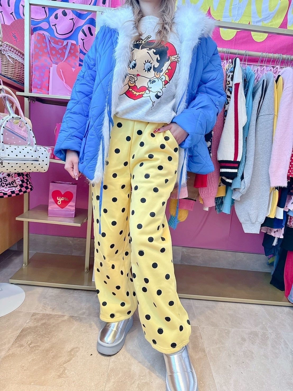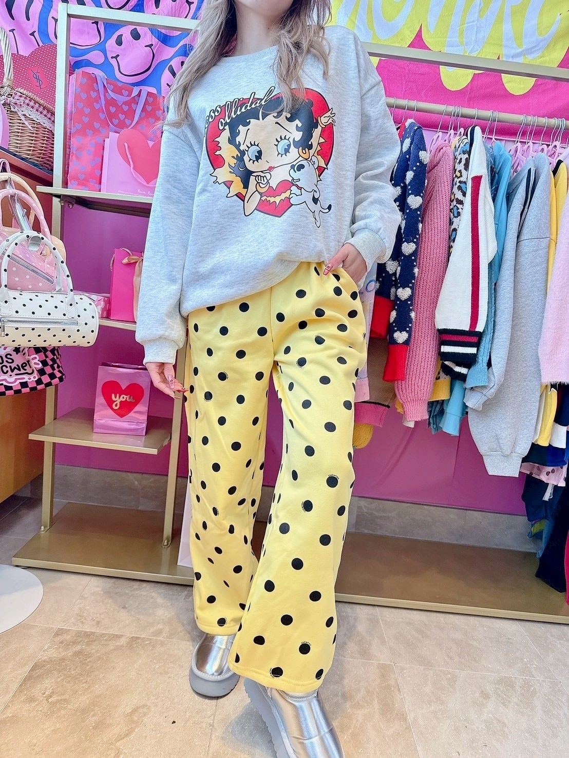 Yellowドットスウェットパンツ/裏起毛/韓国/レディースファッション/可愛い/おしゃれ/ラフ/カジュアル/POP/派手/個性(5-208)