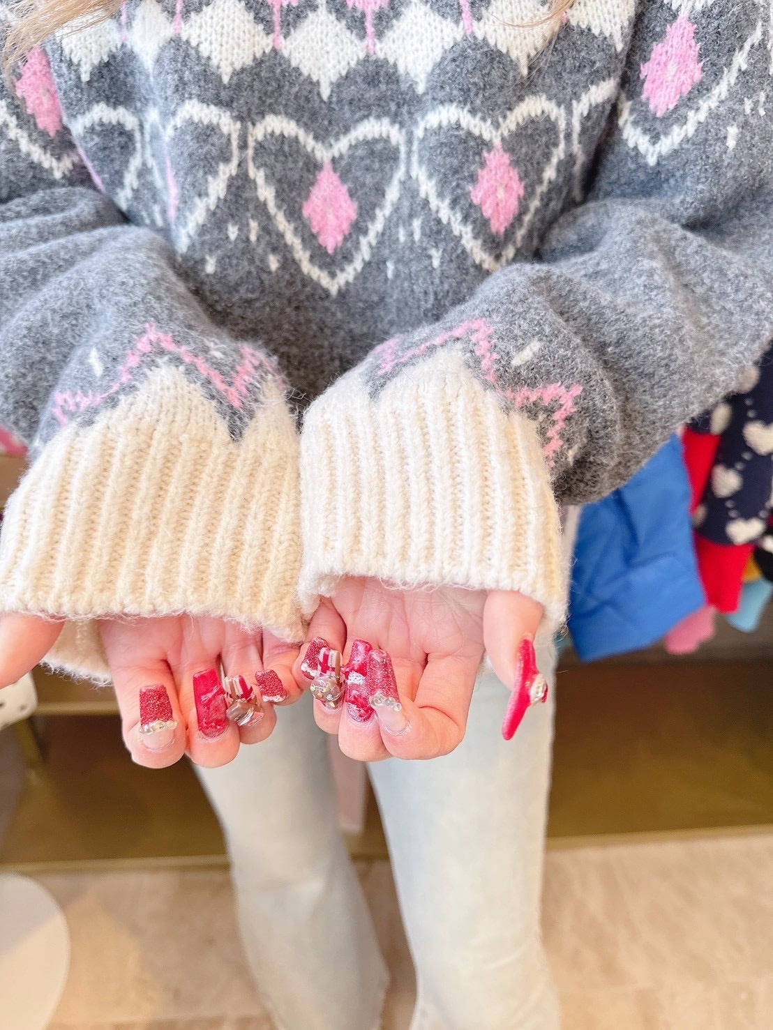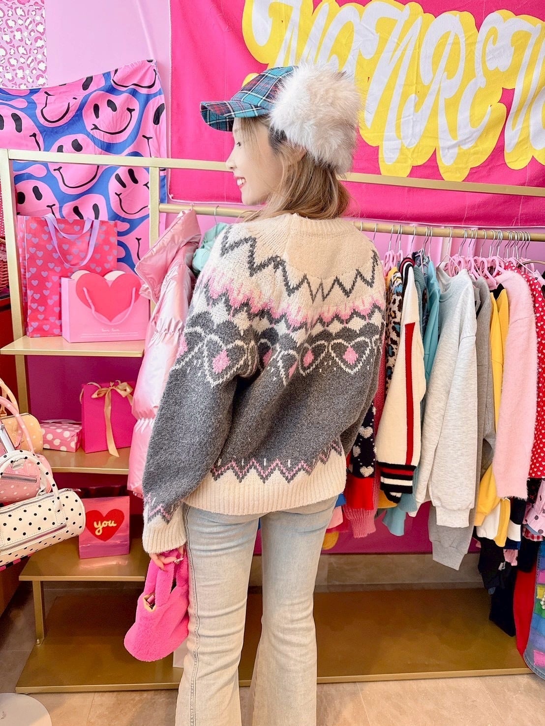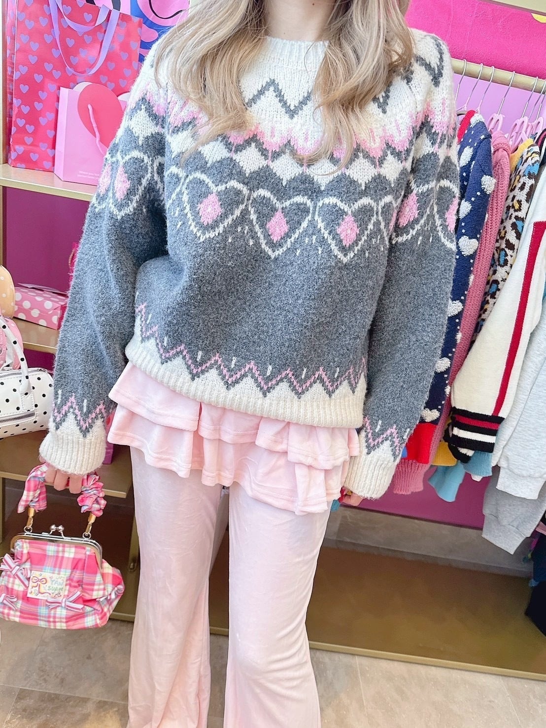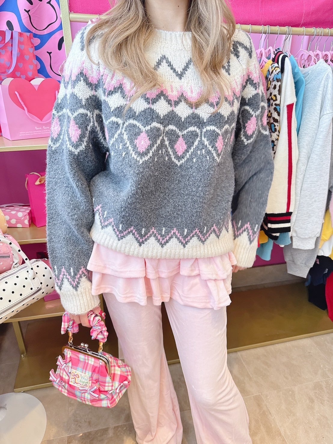 Gray×Pinkニットトップス/韓国/レディースファッション/冬/ノルディック/大人/厚手/可愛い/カジュアル/ラフ(6-236)