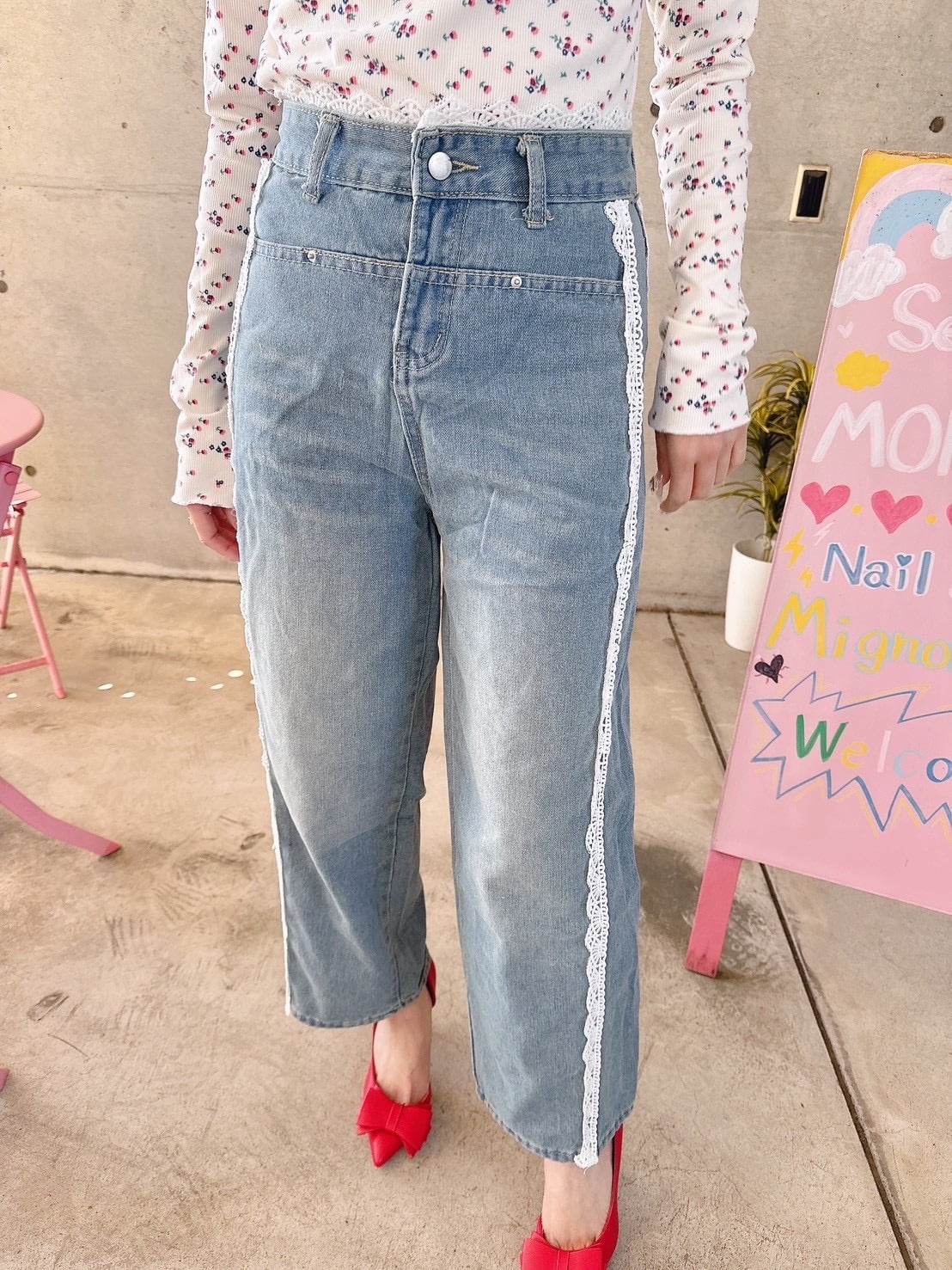 デニムレースワイドパンツ♡/韓国/レディースファッション/可愛い/おしゃれ/ラフ/可愛い/カジュアル/デニム/ボトムス(5-214)