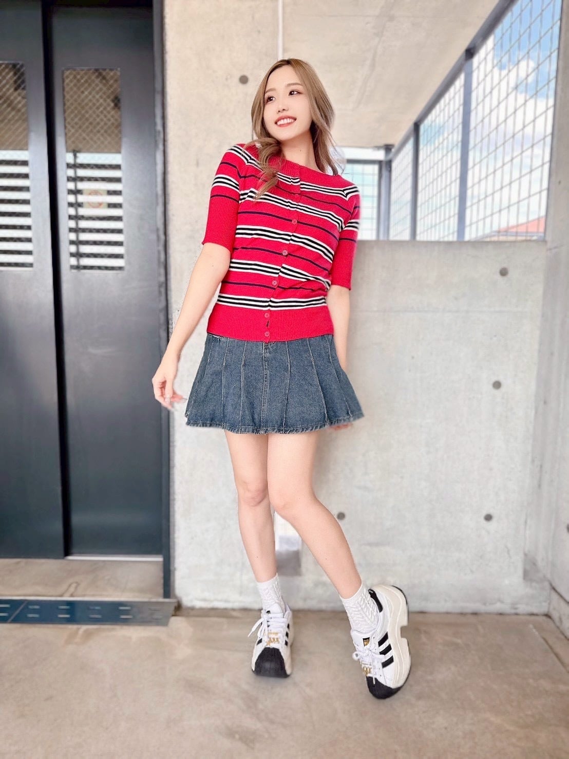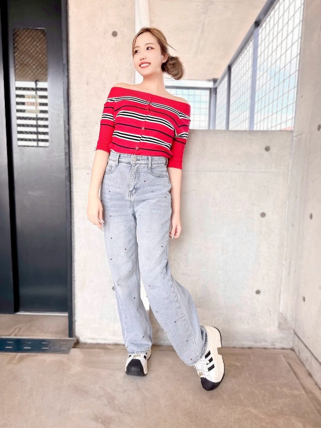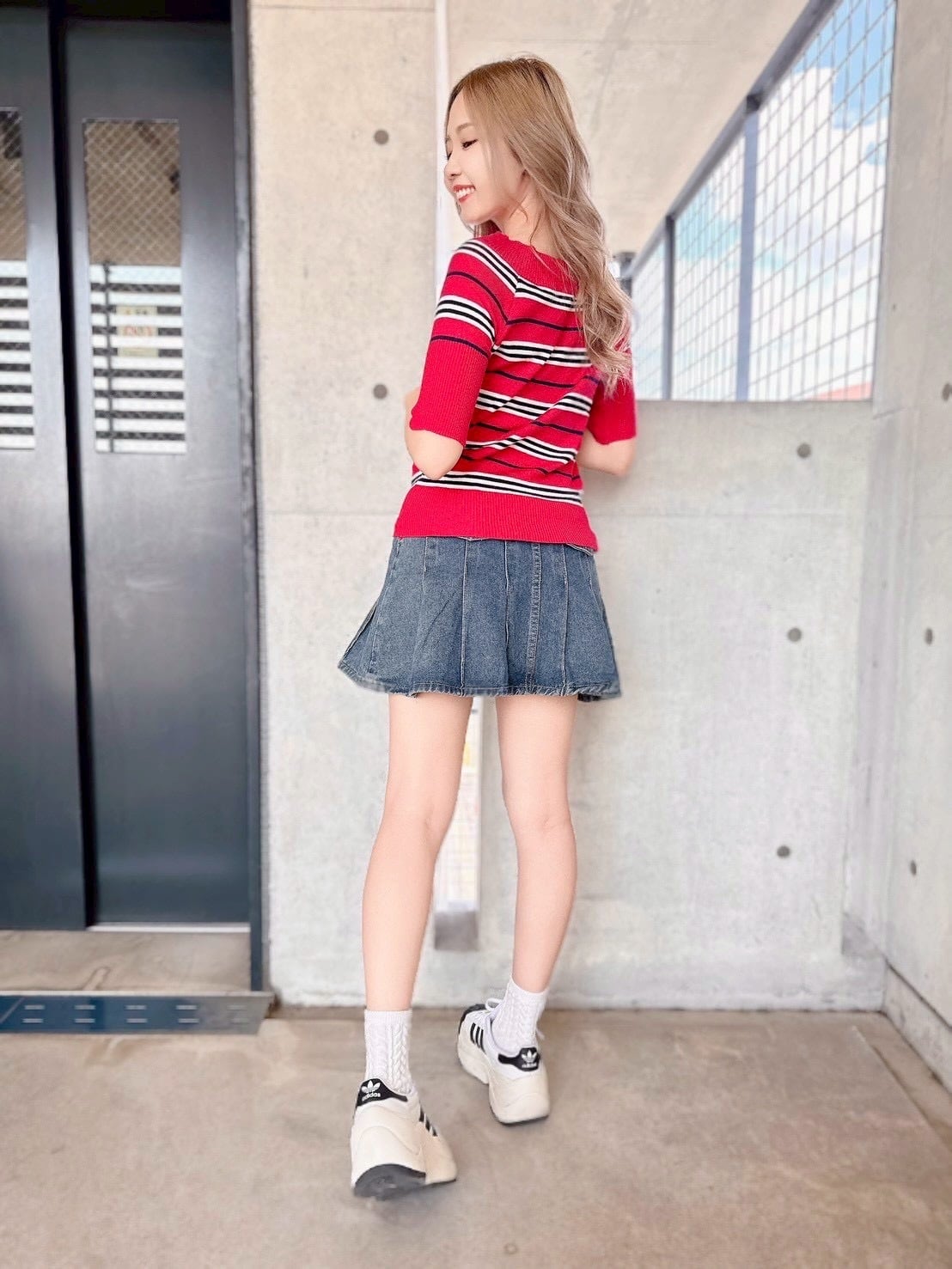 鮮やかなレッドカラーがオシャレ感あるコーデに♡
